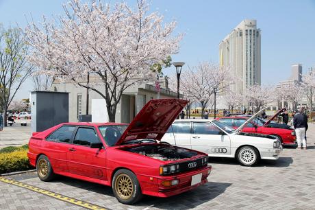 今年は快晴で気温が高く、しかも桜が満開。お花見を兼ねてクルマを見学できるという、これ以上ない絶好のイベント日和でした。ちなみにこの日に参加したグループB車両は、5台のアウディ・クワトロと、うちのシトロエン BX 4TCの計6台でした。